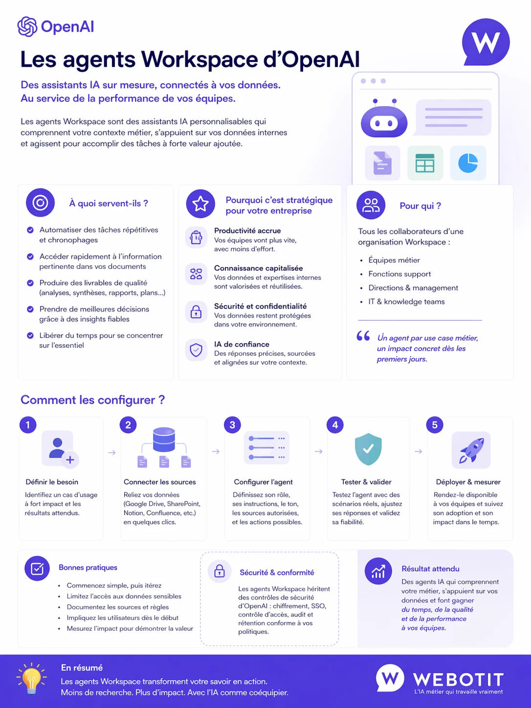 Webotit.ai, spécialiste français de l'IA conversationnelle pour les ETI, déploie des agents IA orientés client qui répondent à ces exigences : conformité RGPD native, supervision humaine intégrée, intégration aux outils métier (CRM, GED, téléphonie). Un chatbot relation client qui résout ≥90% des demandes sans escalade ne fonctionne pas avec les mêmes contraintes qu'un agent interne de productivité.